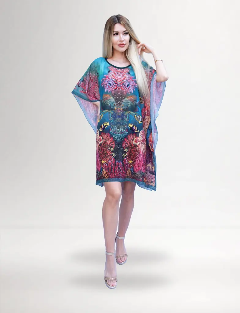 Dive into luxury with our Deep Ocean Lace Silk Caftan. Effortlessly chic, it’s the perfect blend of style and comfort.